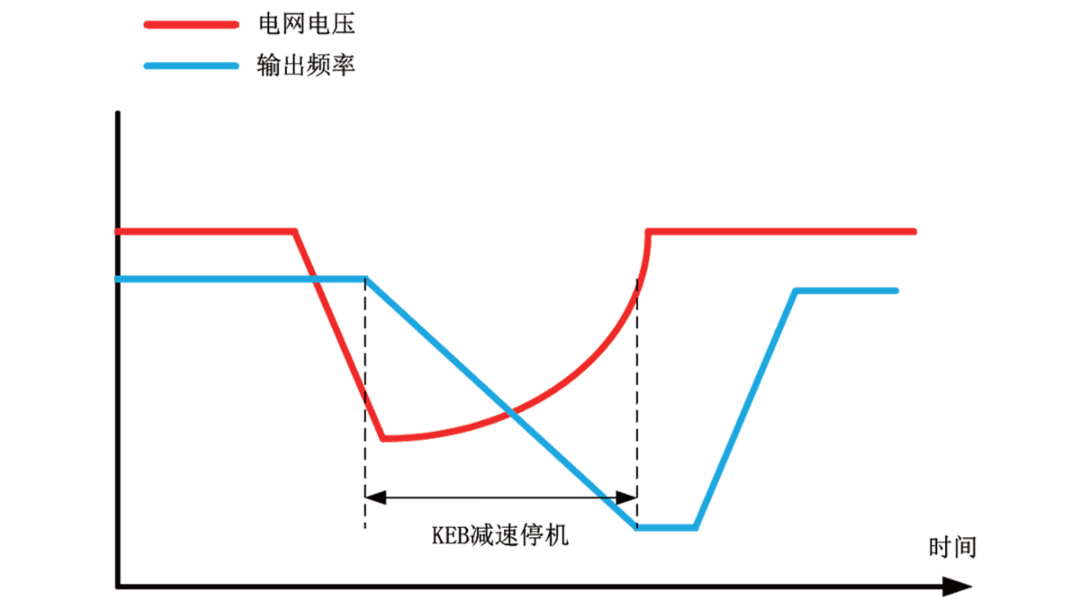 電網瞬間掉電時,變頻器受控減速,減少因電網瞬間掉電,造成的生產中斷。