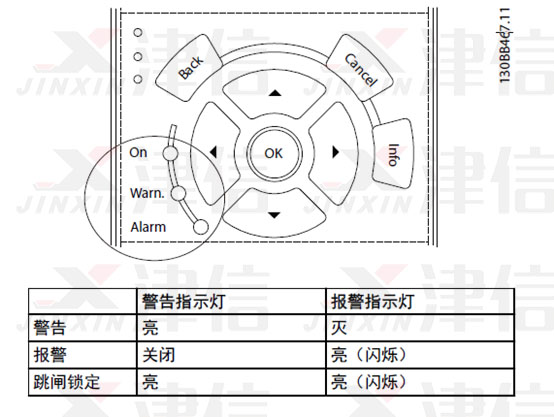 當丹佛斯變頻器出現故障時,警告和報警通過以下兩種方式顯示: