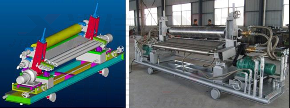 如圖中所示:設備采用了上下兩個壓輥,玻璃從兩個壓輥中間經過,完成壓延。在壓延過程中兩個輥需要同步,使玻璃平滑。