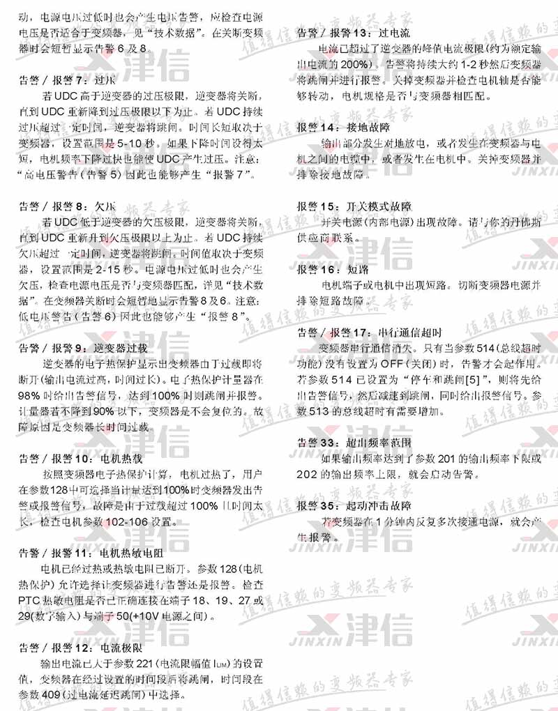 | 故障代碼 | 故障描述 | 警告 | 報警 | 跳閘鎖定 |