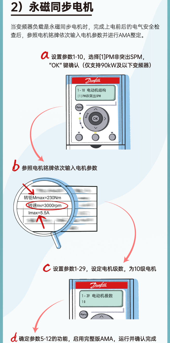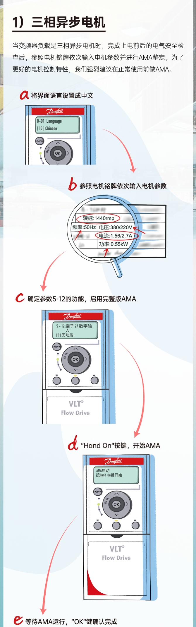 丹佛斯變頻器AMA是測量停止狀態下電動機上的電氣參數,在系統試運行以及根據所應用的電機對變頻器進行優化調整時非常有用。