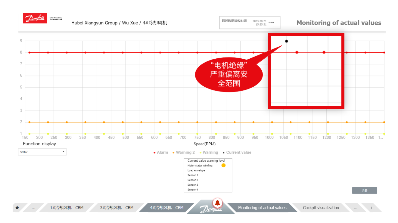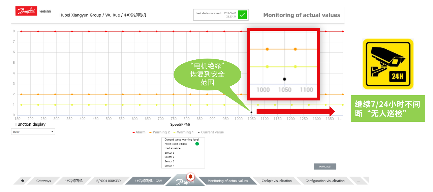 改造方案的目的是讓現(xiàn)場技術(shù)人員能夠?qū)ο到y(tǒng)進(jìn)行實時監(jiān)控,同時可以提前預(yù)警,防止非計劃停機。祥云化工最終同丹佛斯達(dá)成一致,合作開發(fā)數(shù)字化解決方案,增加丹管家+CBM(電機繞組絕緣,電機負(fù)載包絡(luò)),并于2021年年底正式上線。