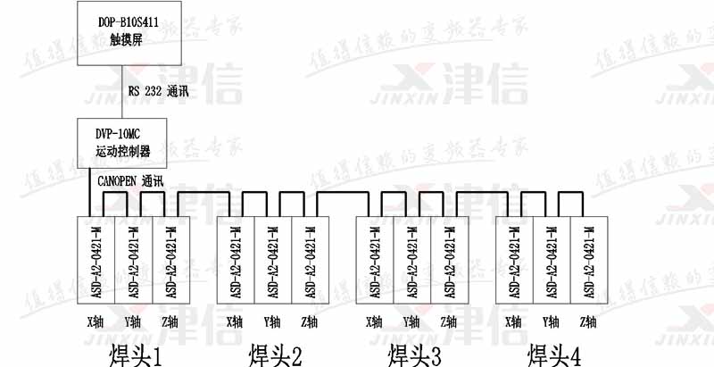 目前市場上以單焊頭超音波焊接機為主,但是單焊頭存在占用場地,效率低等缺點,所以上海津信為客戶推出了以臺達(dá)10MC11T和ASD-A2-0421-M型伺服驅(qū)動器為主開發(fā)的4焊頭超音波焊接機。