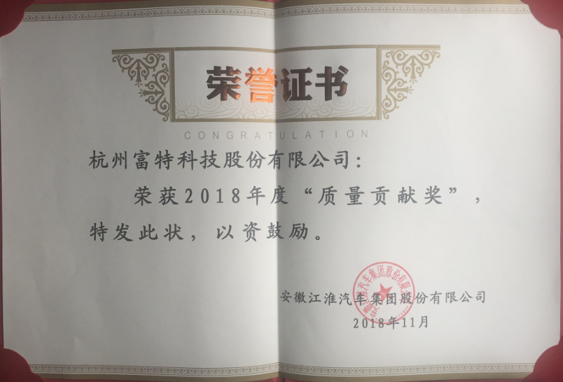 2018年11月26日,公司在江淮汽車集團主辦的年度供應商大會上榮獲2018年度“質量貢獻獎”,為公司零缺陷的經營目標再添一筆精彩的注腳??偨浝砝顚幋ㄏ壬H自出席并登臺領獎,充分顯示了公司對這一獎項的高度重視。