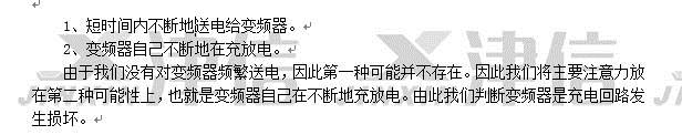更換變頻器充電卡,依次安裝好變頻器的電源卡,控制卡,操作面板及上蓋板等。檢查變頻器的二極管特性及對(duì)地絕緣,符合送電的標(biāo)準(zhǔn)。將變頻器送電,自檢通過(guò)后,測(cè)量輸入側(cè)電源電壓,輸入變頻器參數(shù),開(kāi)機(jī)輸出電壓平衡。帶負(fù)載測(cè)量輸入和輸出電流平衡,變頻器修復(fù)。