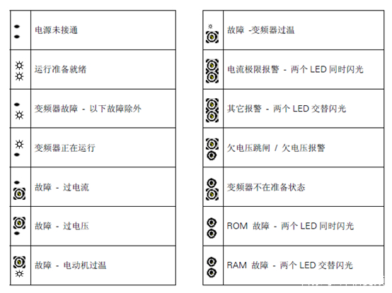 西門子變頻器的上,下兩個(gè)ALM指示燈有四種狀態(tài),分別是燈滅,長(zhǎng)亮,快速閃爍,和閃爍,分別代下以下含義: