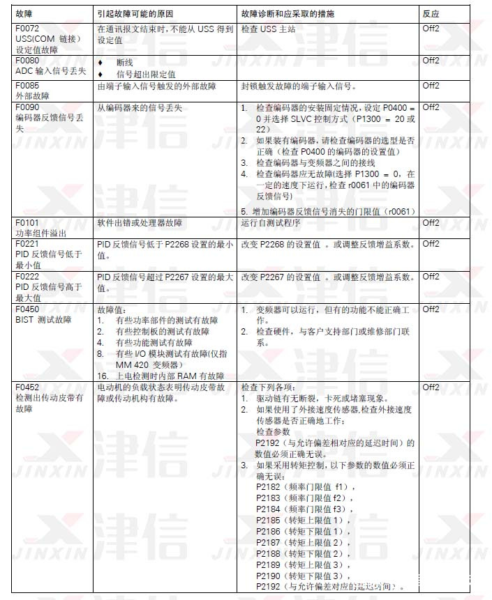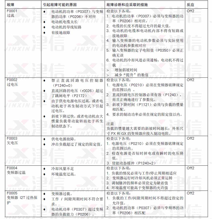 西門子變頻器在發(fā)生故障時(shí),會(huì)在LED顯示屏上出現(xiàn)故障代碼,故障代碼是以F開頭的5位數(shù)表示,F(xiàn)代表Fault。
