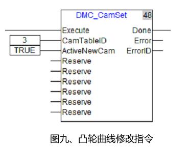在實際使用中,因客戶產品的多樣性,不同的馬達定子,客戶需要隨時修改電子凸輪曲線,通過10MC運動控制器的“DMC_CamSet”指令可以在線實時修改電子凸輪曲線,提高了設備的通用性。凸輪曲線修改指令如圖九所示,在線修改凸輪曲線界面如圖十所示。