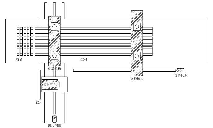 型材的長度可能達(dá)到數(shù)米,但送料絲桿的長度是有限的,因此需要采用往復(fù)式的送料方法,當(dāng)送料機(jī)構(gòu)的剩余進(jìn)給距離已經(jīng)不足以完成下次送料,送料機(jī)構(gòu)將自動(dòng)退回到合適的位置,重新開始送料。