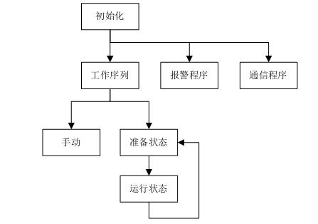 開機(jī)后,首先進(jìn)行通信和狀態(tài)的初始化。初始化完成后同時(shí)調(diào)用工作序列、報(bào)警和通信子程序。工作序列中,包含手動(dòng)和自動(dòng)兩種狀態(tài),自動(dòng)運(yùn)行又包括單次鋸切和連續(xù)鋸切兩種工作模式。報(bào)警程序用于對機(jī)器狀態(tài)進(jìn)行實(shí)時(shí)監(jiān)控,并根據(jù)故障情況執(zhí)行相關(guān)動(dòng)作。通信程序用于PLC和變頻器的FC協(xié)議通信,實(shí)現(xiàn)運(yùn)行狀態(tài)和報(bào)警信息的監(jiān)控。