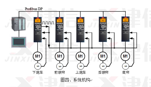 驅(qū)動(dòng)系統(tǒng)的整體結(jié)構(gòu)如圖四,每根軸獨(dú)立按自己的電子凸輪曲線運(yùn)行,屬于典型的分布式控制系統(tǒng),對(duì)主控制器的性能要求,一般的PLC就能勝任。由于每根軸都與主軸保持電子凸輪同步關(guān)系,所以總體上可以實(shí)現(xiàn)多軸同步的控制需求。其中下跑車運(yùn)動(dòng)控制器比較特殊,他具有虛擬主軸脈沖輸出的功能,代替主控制器發(fā)送主軸脈沖信號(hào)。