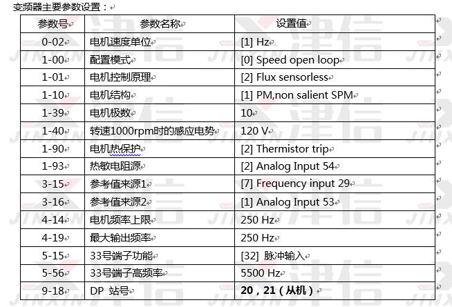 另一臺變頻器做從機,采用丹佛斯特有的脈沖主從控制方式,跟隨主機輸出。實踐證明此種控制方式生立,兩臺電機轉(zhuǎn)速同步性非常好,轉(zhuǎn)速只有很小的誤差。唯一的缺點是從機的報警狀態(tài)無法被系統(tǒng)檢測到。