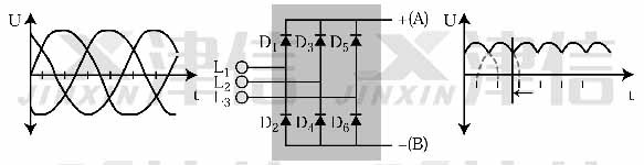 圖1是變頻器整流部分的結(jié)構(gòu)及工作原理圖。變頻器通過三相整流橋?qū)⑤斎雮?cè)的三相交流電壓整流為帶有六脈沖尖峰的直流電壓。原來每一相的反相半個周期電壓疊加在正相電壓之上,因此在直流電壓上產(chǎn)生了周期為1/6正弦周期的脈沖波紋。