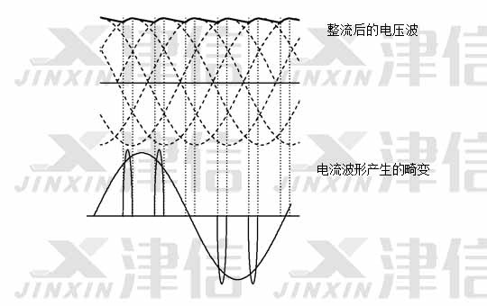 圖2則表示出由于直流電壓上存在六脈沖的波紋,導(dǎo)致了電網(wǎng)會在每個電壓脈沖的尖峰時刻對變頻器直流儲能回路(主電容)進行充放電。因此導(dǎo)致了變頻器的輸入電流波形也產(chǎn)生了畸變。