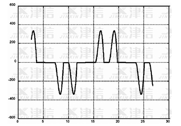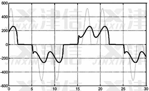 圖3是在高壓示波器上測量出的輸入側(cè)電流波形圖,在此圖上可以清晰的看出變頻器輸入側(cè)電流波形所產(chǎn)生的畸變。