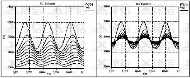 圖6中顯示的是加裝交流和直流電抗器對直流整流電壓的影響。從測量結(jié)果可以清晰看出加裝交流電抗器雖然對直流電壓上的高次諧波(520VDC以上)有明顯的抑制作用,但同時會造成直流側(cè)電壓的明顯損失。而直流電抗器在濾除高次諧波的同時對于直流電壓不會造成任何電壓損失