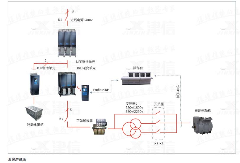 這個(gè)項(xiàng)目是Danfoss公司首次同天作電氣的合作項(xiàng)目;項(xiàng)目中采 用了以丹佛斯公司VACON® NX系列變頻器為電源核心的測(cè)試電源解決方案。單元+逆變單元+制動(dòng)單元)、正弦濾波器、升壓變壓器、制動(dòng)電阻以及輸出電壓切換開關(guān)構(gòu)成。可以提供最高至2250V的正弦電壓輸出。天作電氣成柜。另外包含測(cè)試操作臺(tái),以及為了滿足測(cè)試工藝而選用的各種傳感器,功率分析儀器等。
