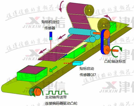 當傳送帶上的物品碰到“貼標啟動傳感器”后,凸輪啟動,所以在進行貼標動作時,主軸跟凸輪軸必須是同一速度,如此才可保證在貼標過程中不會出現(xiàn)拉扯現(xiàn)象。