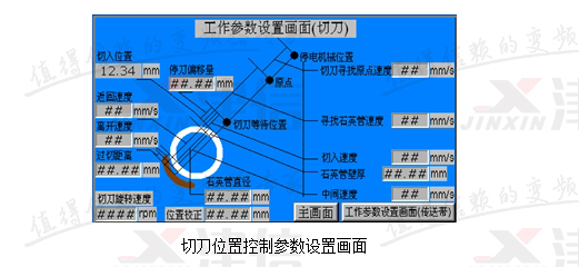 石英切割機有三個控制部分構(gòu)成:切刀旋轉(zhuǎn)控制、切刀位置控制和送料位置控制。切刀旋轉(zhuǎn)控制只要速度可調(diào)即可;切刀位置控制需要在切割石英管或石英棒的過程中控制其位置和不同段內(nèi)的速度,首先要保證切割產(chǎn)品的刀口質(zhì)量,同時要提高生產(chǎn)效率;送料位置控制需要每次往前送設定長度的石英管或石英棒,精度要求0.2毫米。