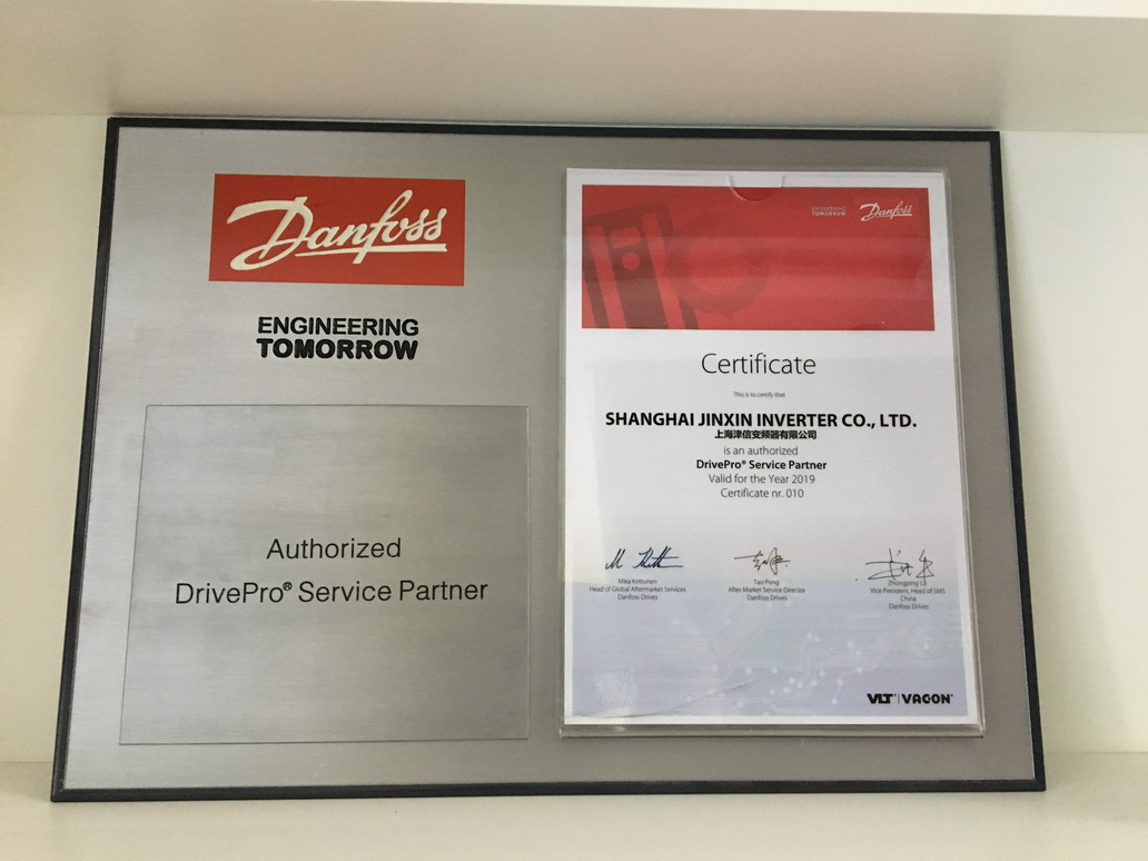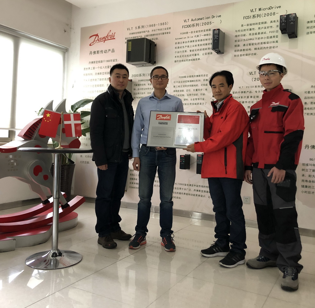 2018年12月11日, 丹佛斯中國區(qū)服務(wù)總監(jiān)彭濤先生和服務(wù)經(jīng)理毛申麟先生向上海津信變頻器有限公司頒發(fā)了丹佛斯授權(quán)“DrivePro®”服務(wù)商的授權(quán)證書。上海津信成為全球第十家,中國華東和華南地區(qū)丹佛斯授權(quán)“DrivePro®”服務(wù)商。